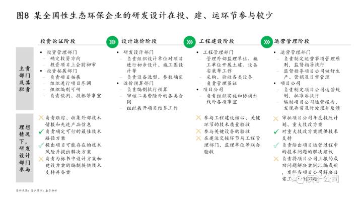 國內(nèi)生態(tài)環(huán)保企業(yè)“重投建、輕技運(yùn)”的問題由來已久,由于沒有將研發(fā)設(shè)計(jì)放在一個(gè)正確的位置與高度,導(dǎo)致總部-事業(yè)部-項(xiàng)目公司的研發(fā)設(shè)計(jì)定位不清,該總部牽頭做的沒人做,該項(xiàng)目公司負(fù)責(zé)的,由于目的明確、相對(duì)簡單,各級(jí)主體“搶著做”,原本有限的技術(shù)資源散亂在內(nèi)部的各個(gè)層級(jí)和角落,沒有形成各司其職、各盡其責(zé)、上下一致的合力。