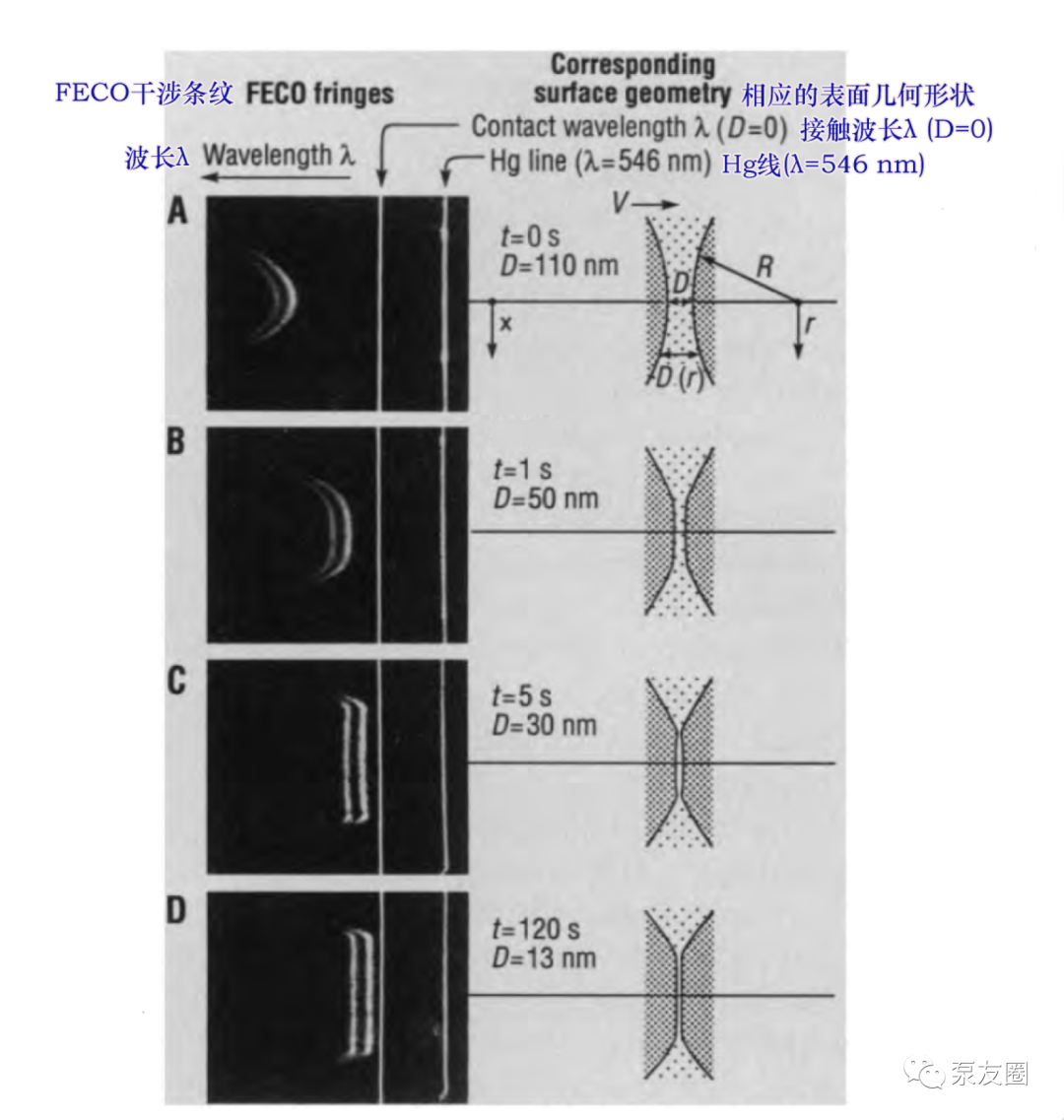 圖1顯示了 pbd 中粘度為 180 p的兩個接近表面的 feco 條紋圖案隨時間變化。最初(圖 1a)表面以穩(wěn)定的速度 v 相互接近但不變形。當(dāng)表面相距約 50 nm 時(圖 1b),由于支撐材料的扁平化和壓縮,它們開始相對于彼此減速。