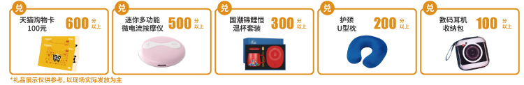 注:積分可在展會現(xiàn)場兌換天貓購物卡、按摩儀、恒溫杯套裝、u型枕等精美禮品。
